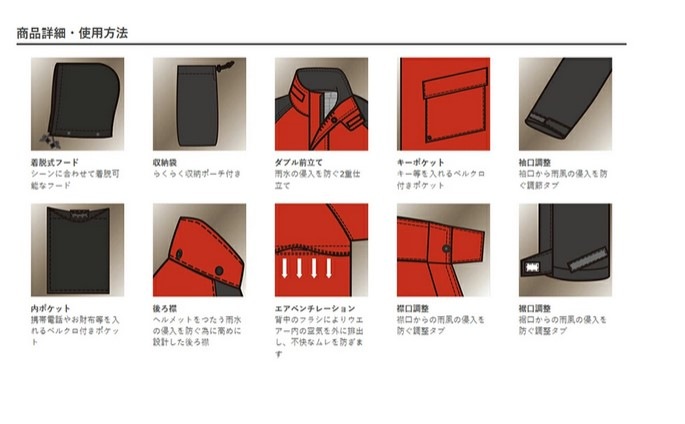 「雨の日の乗車を快適にする」ことを主眼に設計されたバイク用レインウェア