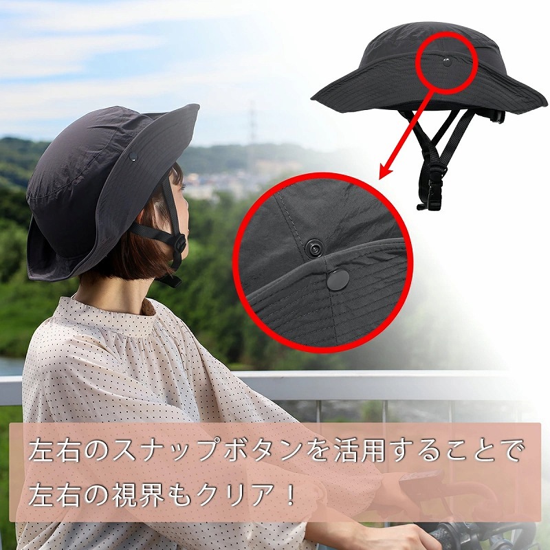 ※自転車運転中は必ず左右のスナップを固定してつばを上げたままで乗ってください。